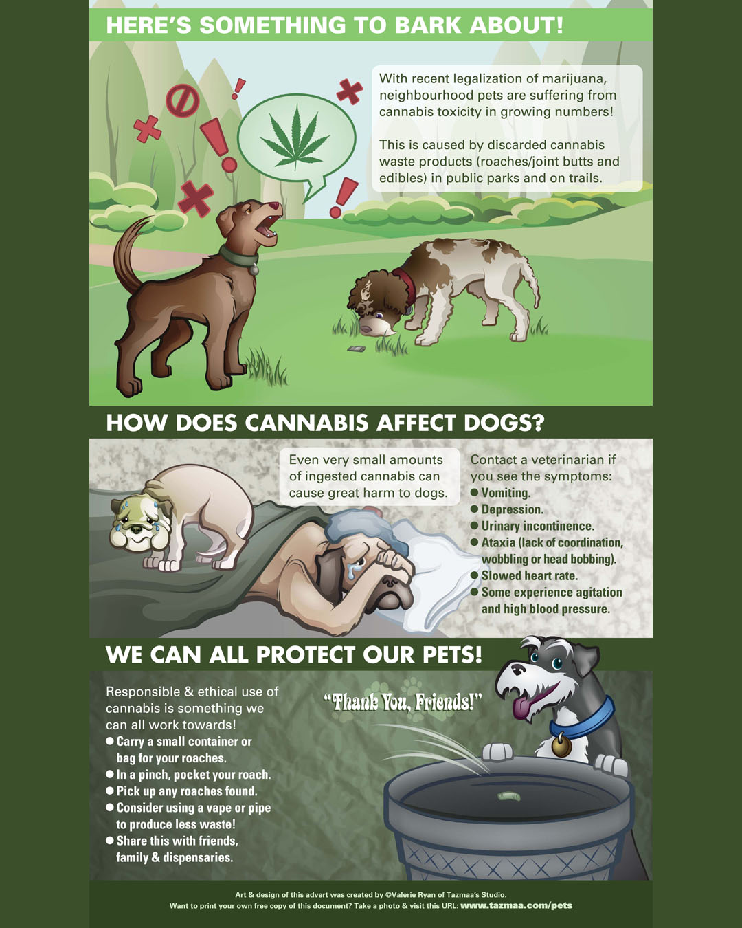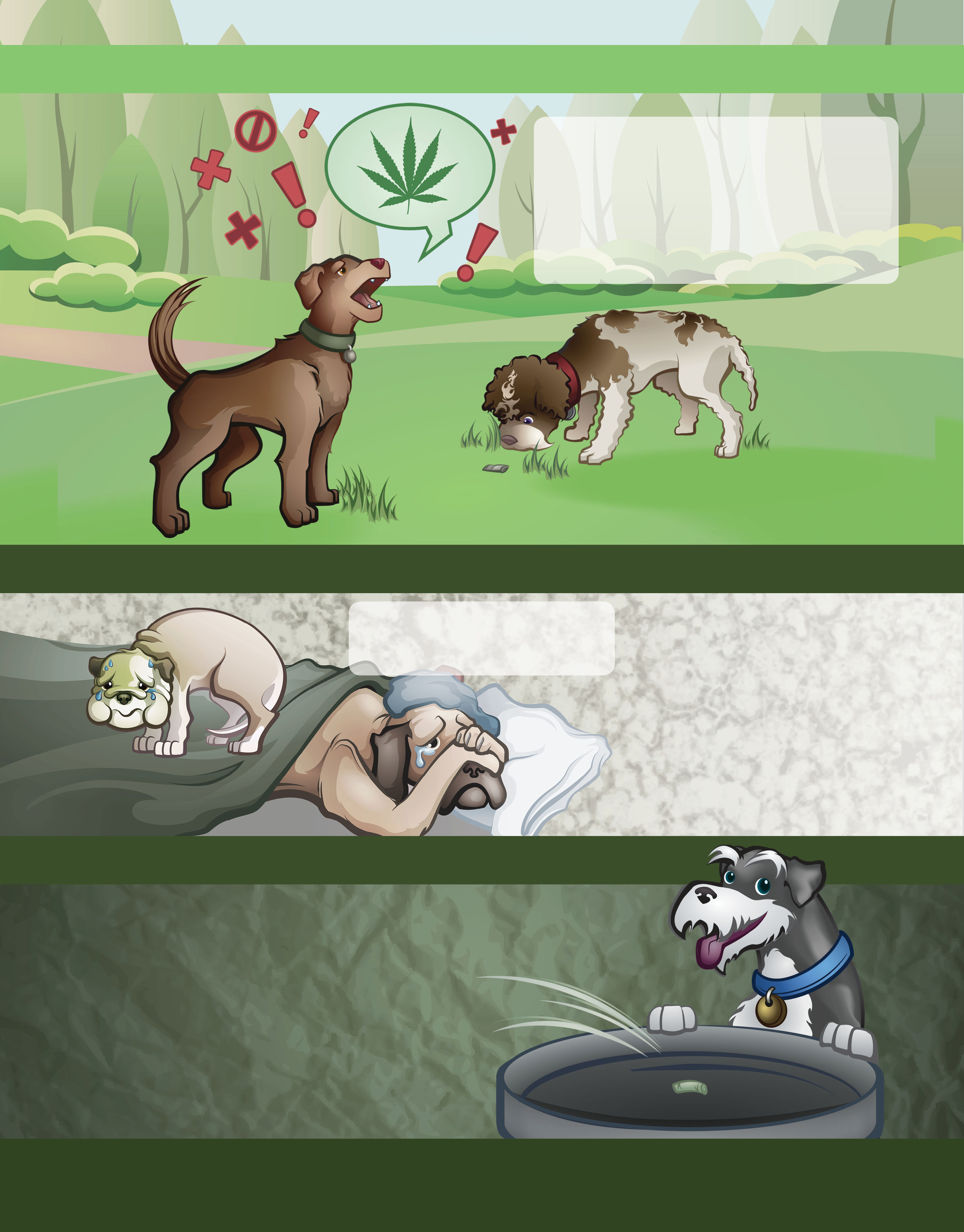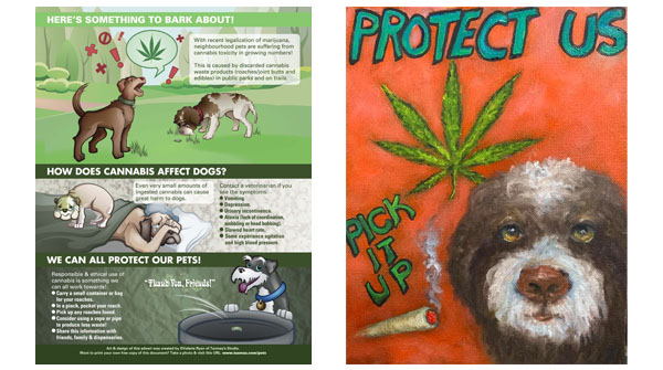 These artworks were created by Valerie Ryan. She has offered them free of copyrights as long as they are used to raise awareness of marijuana toxicity in pets or the safe disposal of cannabis products.